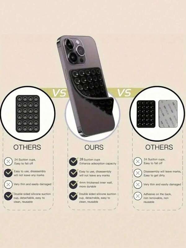 How to Use: Ensure both your phone back and the mounting surface are clean and dry. Press firmly to engage the suction. To remove, gently peel from the edge.